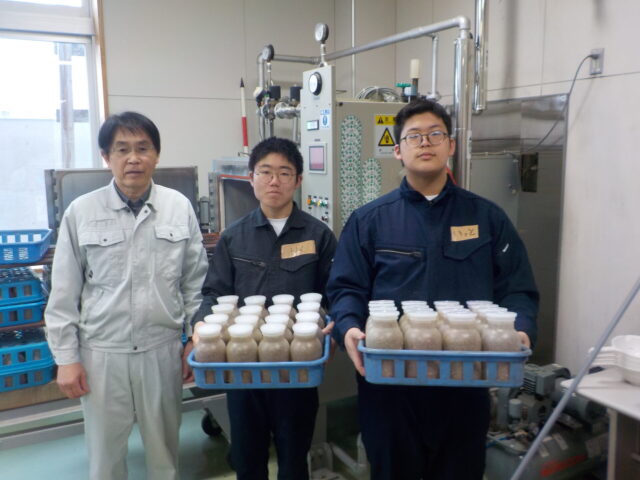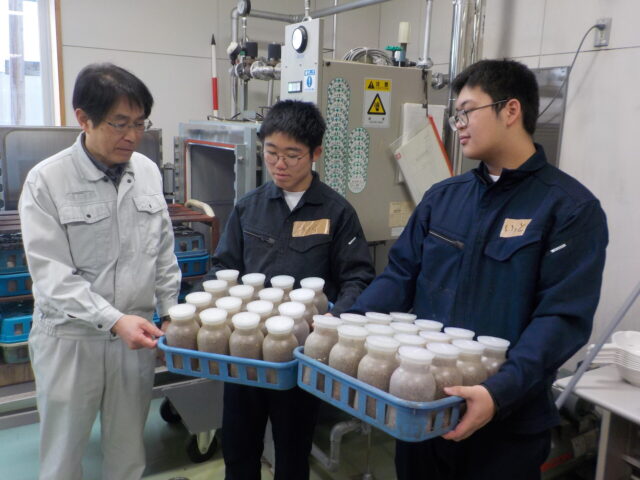 実習では、菌床ブナシメジの「仕込み」から「種菌の接種」まで、教科書だけでは学べない現場の微細な感覚やノウハウを、生徒たちへ直接ご指導いただきました。