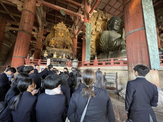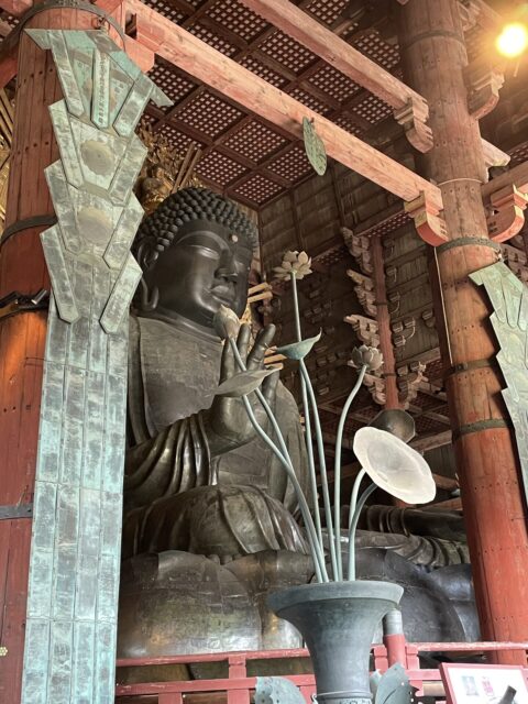 そのあと奈良公園に移動し、「神の使い」である鹿と触れ合ったあと、大仏殿で奈良の大仏とご対面。その巨大さに圧倒されました。