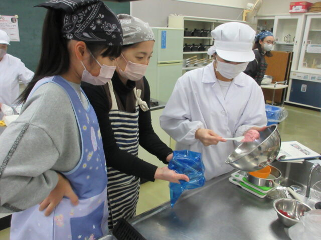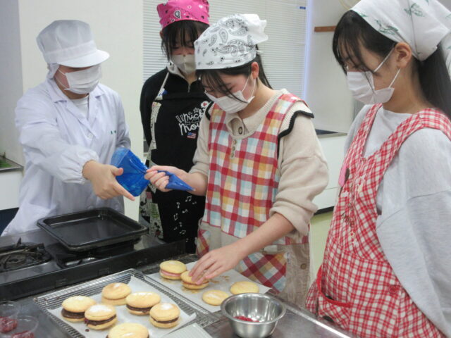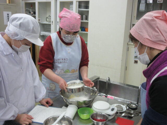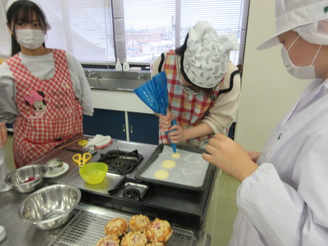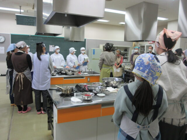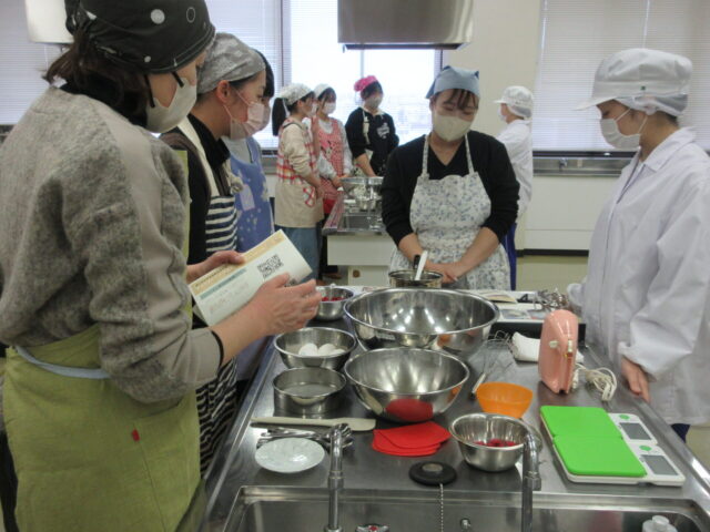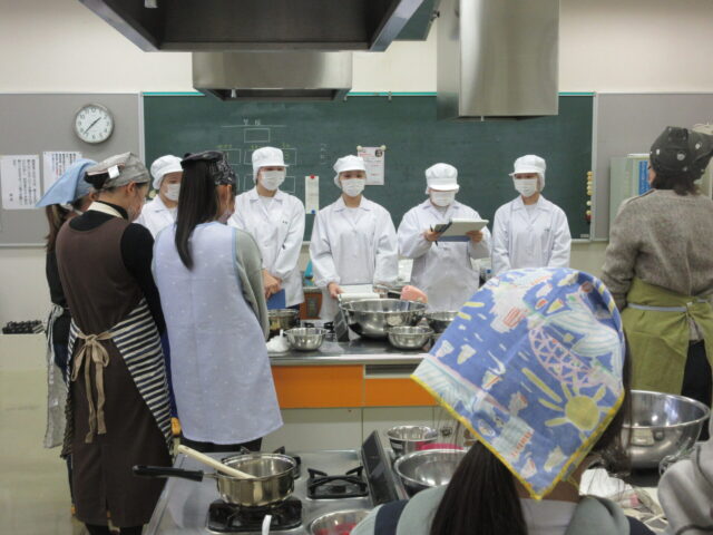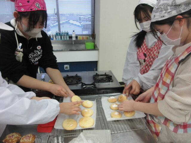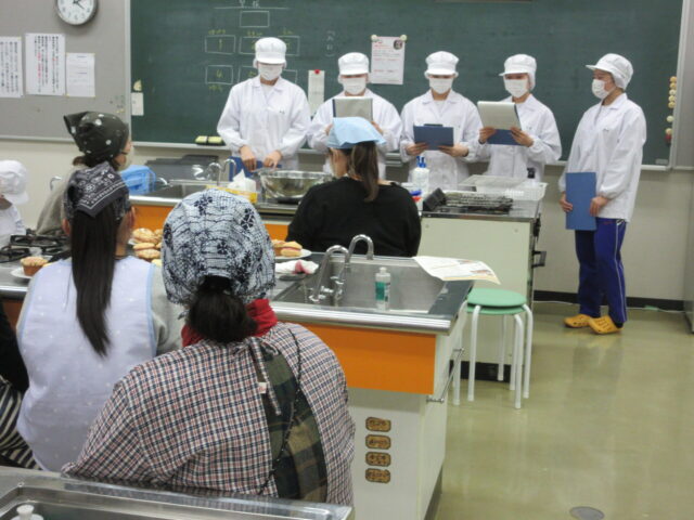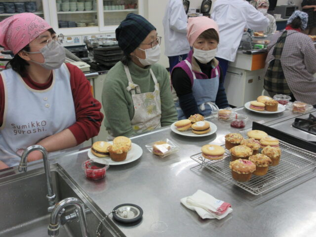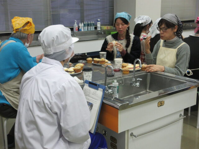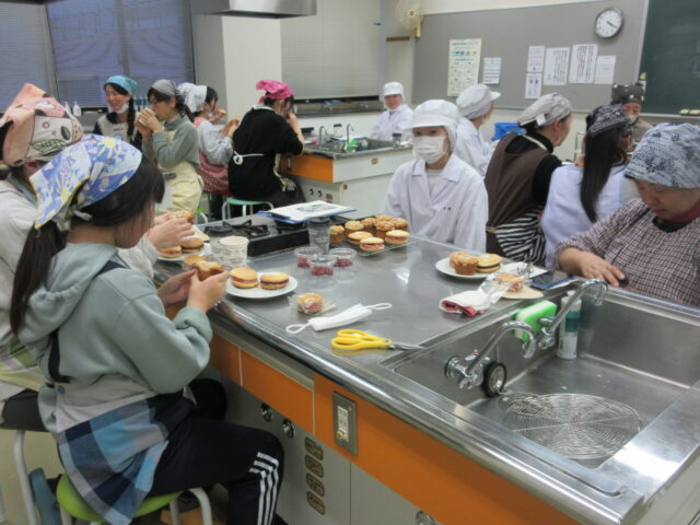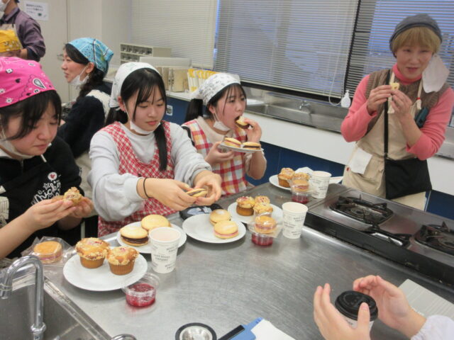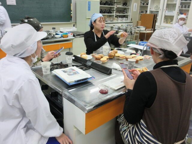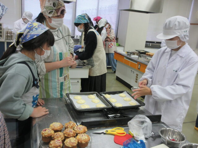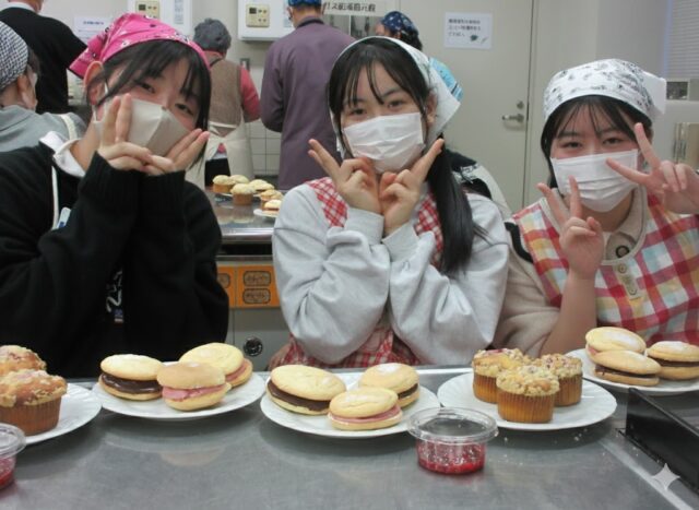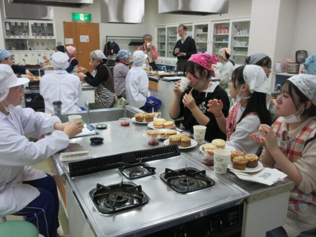 焼き上がりの甘い香りが漂う調理室は、笑顔が溢れる素敵な空間に。試食タイムには、私たちの課題研究についても発表させていただき、深い交流ができました。アンケートでいただいた「高校生の対応が素晴らしかった」という全員からの言葉を励みに、これからも研究に励みます!