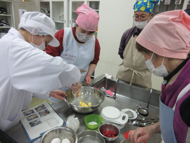 今回挑戦したのは、ラズベリーの甘酸っぱさを主役にした「クランブルケーキ」と「ブッセ」です。小学生から大人まで幅広い世代の皆さんと交流しながら、楽しくお菓子作りを行いました。中には「昨年に続いて2回目!」という嬉しいリピーターの方や、ラズベリーを研究中の中学生も参加してくださいました。