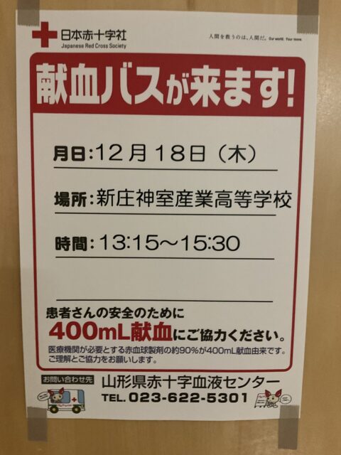 新庄神室産業高校に献血バスがやってきました(^^♪多くの3年生の生徒達、また職員が献血に協力してくれました。生徒の中には、初めて血液型を知ることになる生徒もいたようです。ドキドキしますね(^^♪