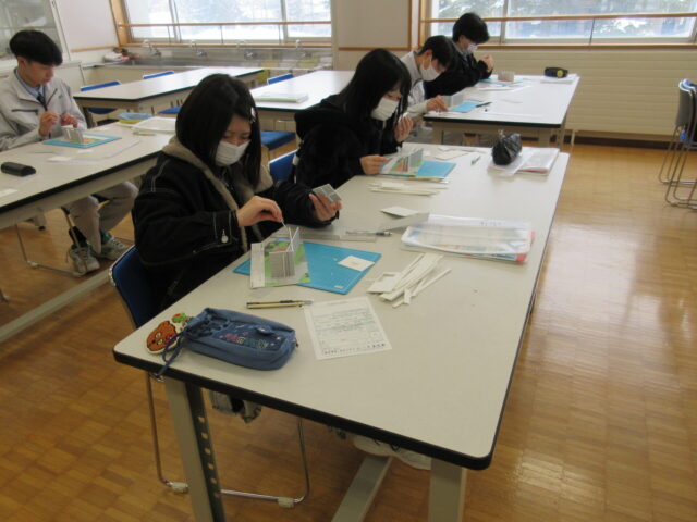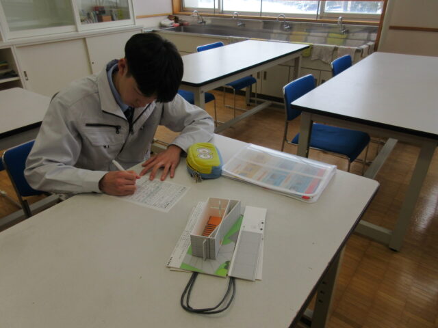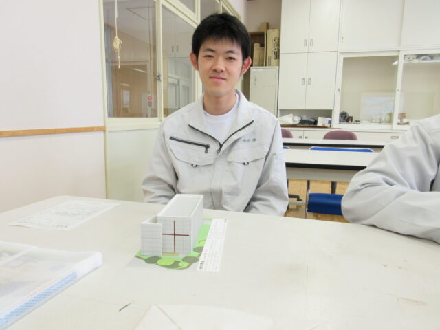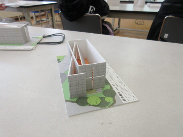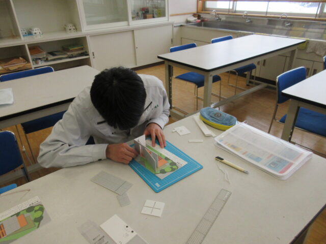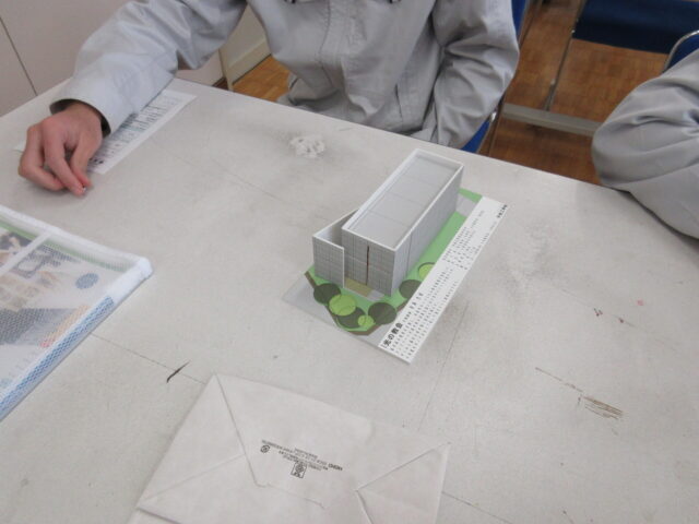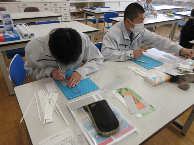 2年生の建築コースの生徒を対象に、中央工学校(東京都:中央工学校 | 建築・インテリア・土木・機械設計・3DCAD | 東京の専門学校)の講師をお招きして、「建築模型づくり」と「最新の建築事情」について学びました。模型は、日本を代表する建築家である安藤忠雄氏設計の「光の教会」を製作しました。また、最先端の建築現場について学習することができました。